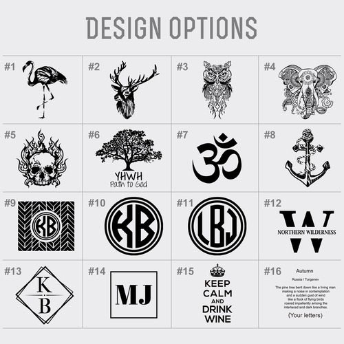 | option | #4 – elepbant, #1 – flamingo, #2 – deer, #3 – owl, #5 – skull, #6 – YHWH path to god wine flask, #7 – yoga, #8 – anchor, #13 – square monogram, #15 – keep calm and drink wine, other design of your design, #9 – chevron monogram flask |