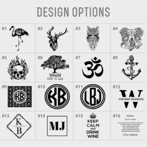 | Design | #1 – flamingo, #2 – deer, #3 – owl, #4 – elepbant, #5 – skull, #6 – tree of life, #7 – yoga, #8 – anchor, other design or your design, #15 – keep calm and drink wine |
