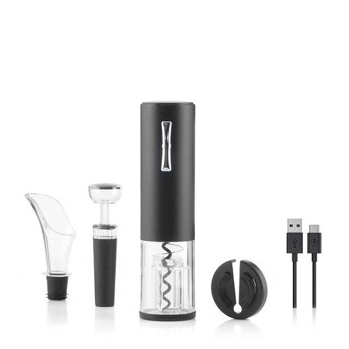 An electric corkscrew with accessories for wine. The original, modern and elegant design makes it an ideal gift. This complete wine set consists of a corkscrew, foil cutter, aerator and vacuum stopper. The corkscrew is very convenient and easy to use for removing corks from wine bottles since it allows quick and easy extraction and removal of the cork in seconds. It features an extraction button, an eject button and LED lights to indicate both actions (blue light while the cork is being extracted and red light while the cork is being ejected). As it is rechargebale and portable, it can also be used at any time and anywhere without the need for cables or plugs. The foil cutter enables the foil to be removed easily and safely before removing the cork, and the aerator is perfect for oxygenating and serving the wine, enhancing its flavour. Once open, to keep the wine in optimum condition, simply insert the vacuum stopper into the bottle and move the piston up and down to remove all of the air from inside. The set Includes a USB to micro USB charging cable.